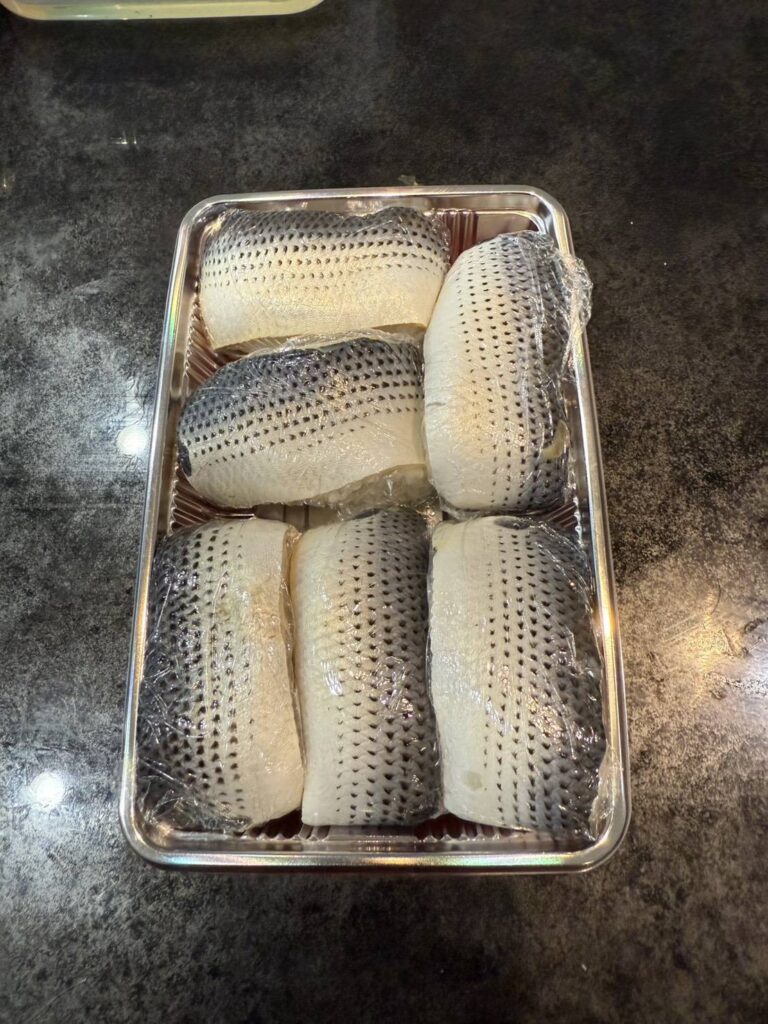 - 水で洗って塩をおとし、水分をふきとってから、つなしの漬け液に1日ほど漬ける。身が白くなったら、取り出し、汁気をきる。