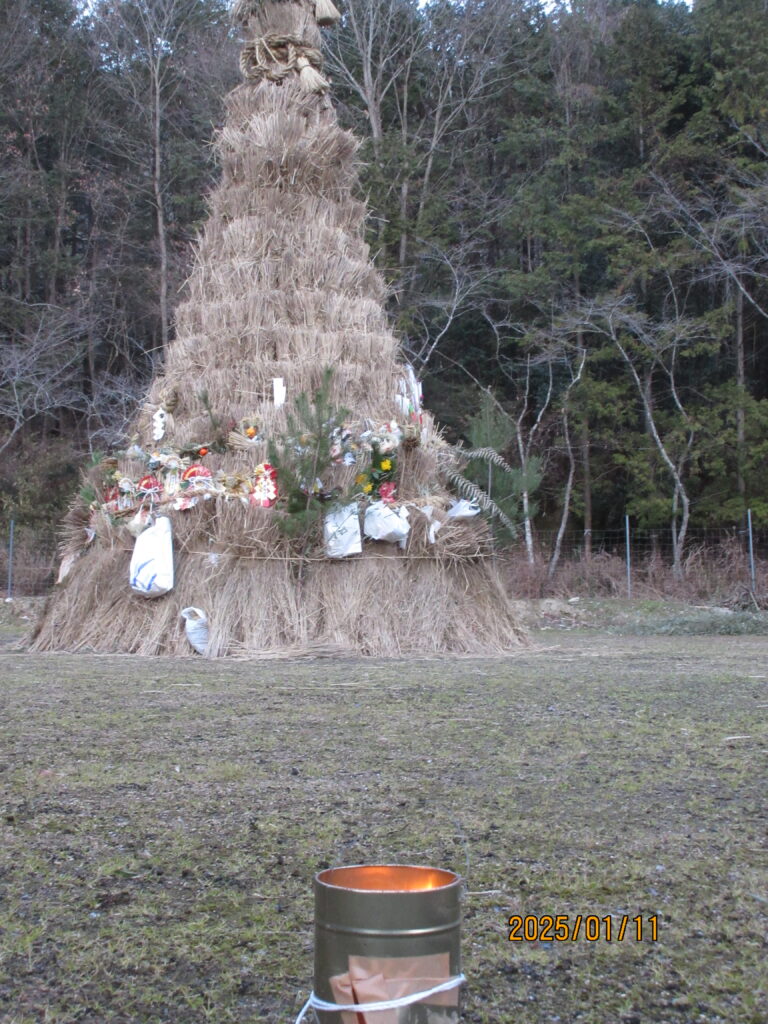 村人総出でとんどたて、無病息災を願い点火します